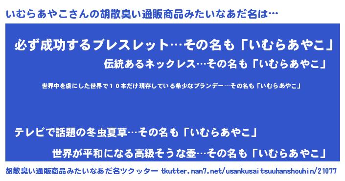 | 意味不明あだ名 | 『住所不定無職いむらあやこ(89歳)』 |
