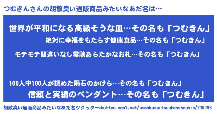 | 男性向けラノベタイトル風あだ名 | 『つむきんの憂鬱』『ツムキンスレイヤー』 |