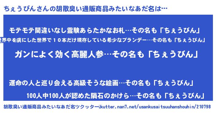 | 意味不明あだ名 | 『自称ちぇうびん』『ペロリンちぇうびん』 |