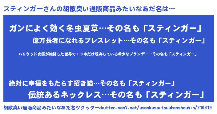 | 意味不明あだ名 | 『住所不定無職スティンガー(71歳)』 |