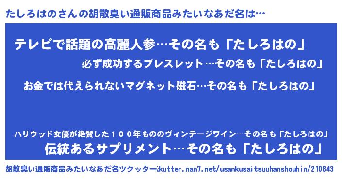 | 男性向けラノベタイトル風あだ名 | 『転生したらたしろはのだった件』 |