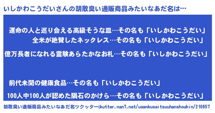いしかわこうだいさんの胡散臭い通販商品みたいなあだ名をツクッター!