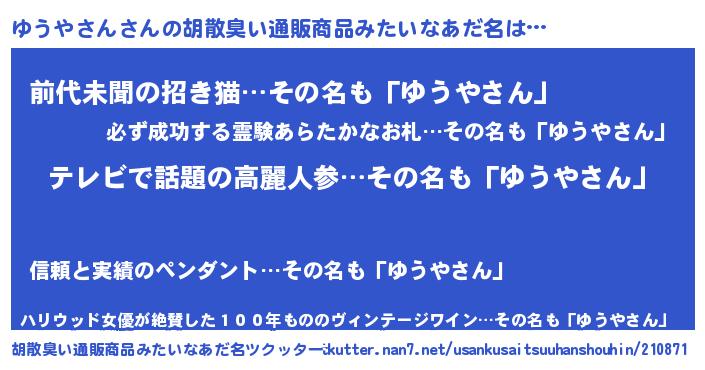 | 意味不明あだ名 | 『自称ゆうやさん』『永久保存ゆうやさん』 |