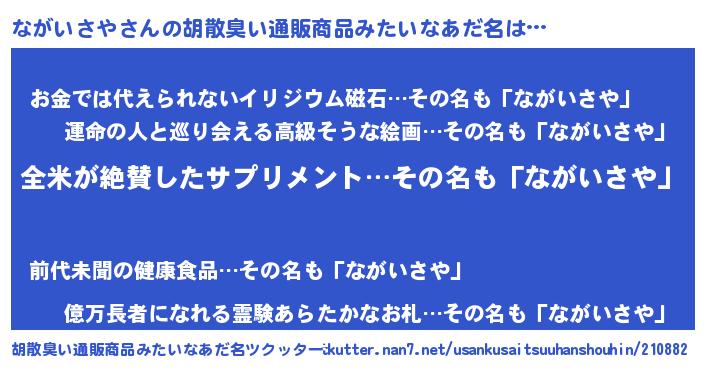| 男性向けラノベタイトル風あだ名 | 『ながいさやの嫁は女の子じゃないと思った?』 |
