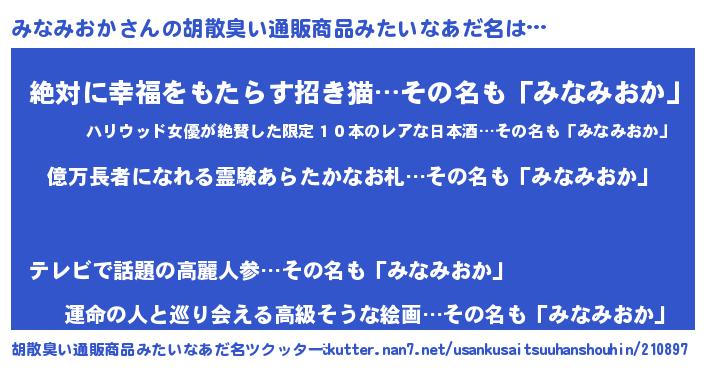 | 男性向けラノベタイトル風あだ名 | 『みなみおか~年齢イコール彼女いない歴の魔法使い~』 |