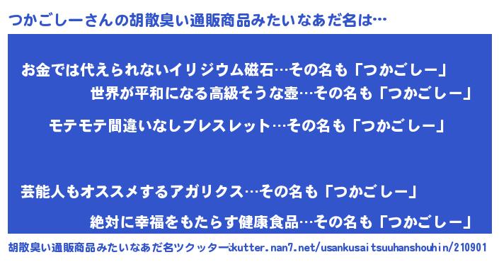 | 男性向けラノベタイトル風あだ名 | 『つかごしーに滅ぼされるだけの簡単なお仕事です』 |
