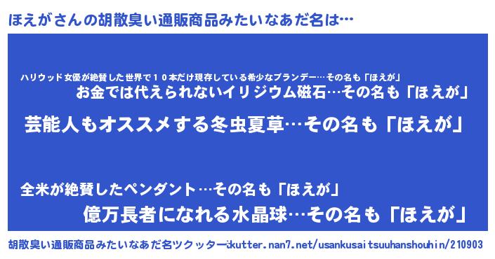 | 意味不明あだ名 | 『自称ほえが』『住所不定無職ほえが(56歳)』 |