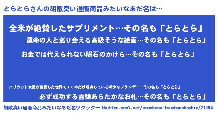 | 男性向けラノベタイトル風あだ名 | 『転生したらとらとらだった件』 |