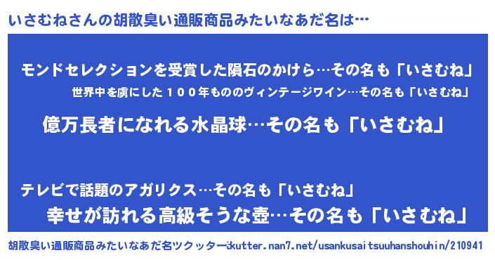 | ヘコむあだ名 | 『いさにゅー』『酢こんぶ』『いさお』 |