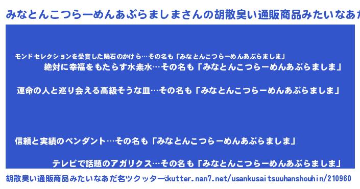 | ヒーロー風カッコイイあだ名 | 『ウルトラみなとんこつらーめんあぶらましまマン』 |