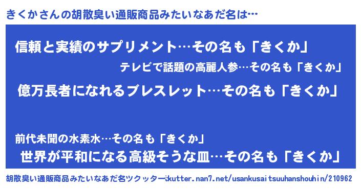 | 男性向けラノベタイトル風あだ名 | 『きくかに滅ぼされるだけの簡単なお仕事です』 |
