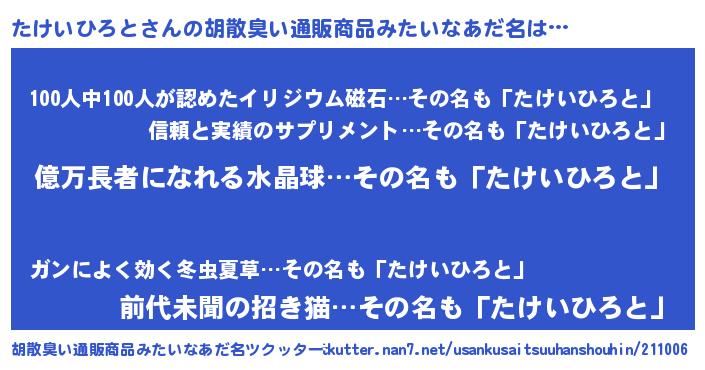 | ヘコむあだ名 | 『たけにゅー』『たけいひろと(苦笑)』 |