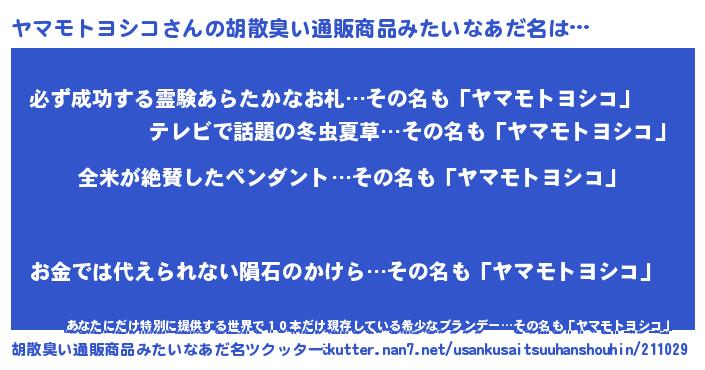 | 男性向けラノベタイトル風あだ名 | 『ヤマモトヨシコの嫁は女の子じゃないと思った?』 |