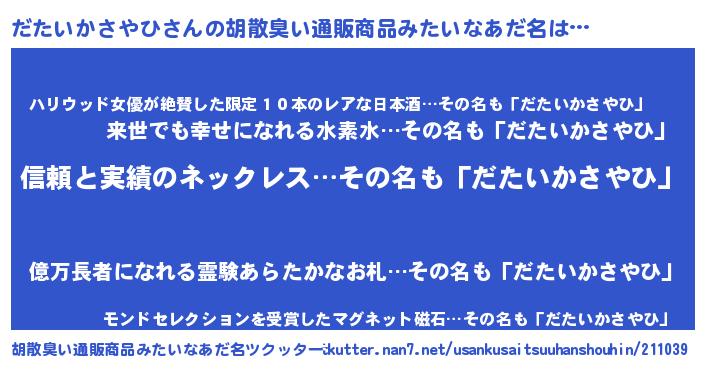 | 意味不明あだ名 | 『とにかく怪しいだたいかさやひ』 |