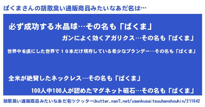 | 意味不明あだ名 | 『住所不定無職ばくま(84歳)』『自称ばくま』 |