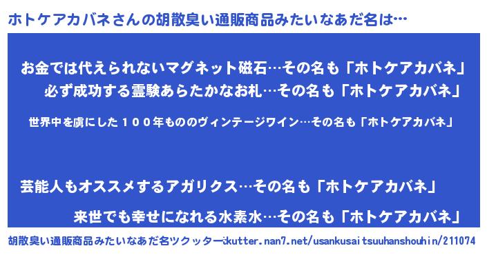| 意味不明あだ名 | 『住所不定無職ホトケアカバネ(1歳)』 |