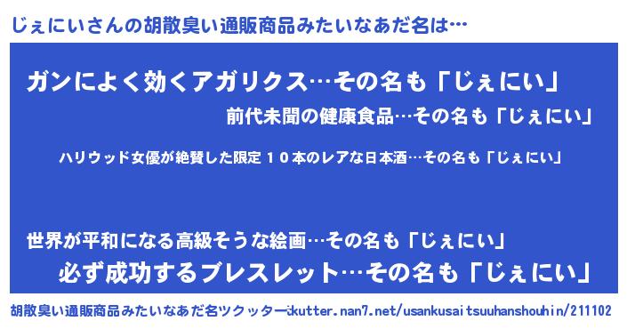 | 男性向けラノベタイトル風あだ名 | 『魔弾の王とじぇにい』『じぇにいの憂鬱』 |