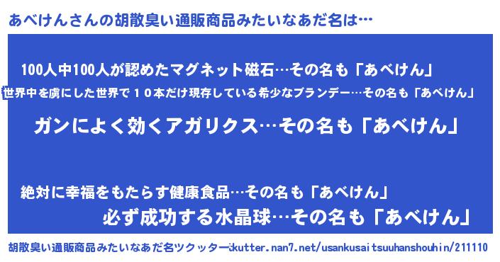 | 意味不明あだ名 | 『自称あべけん』『ペロリンあべけん』 |