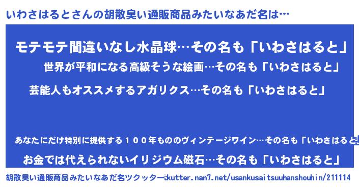 | 男性向けラノベタイトル風あだ名 | 『いわさはると~年齢イコール彼女いない歴の魔法使い~』 |