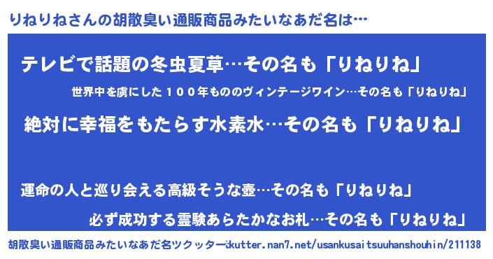 | 男性向けラノベタイトル風あだ名 | 『リネリネスレイヤー』『りねりねの憂鬱』 |