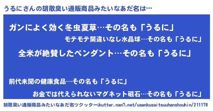 | 意味不明あだ名 | 『とにかく怪しいうるに』『自称うるに』 |