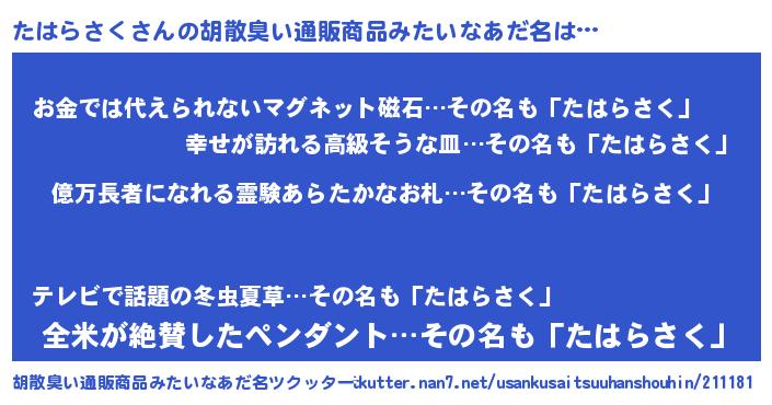 | 男性向けラノベタイトル風あだ名 | 『うちのたはらさくが世界を掌握している!』 |