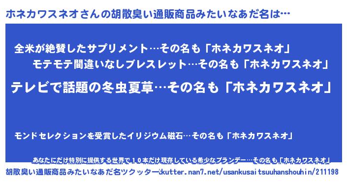 | 男性向けラノベタイトル風あだ名 | 『Re:ホネカワスネオから始める異世界生活』 |