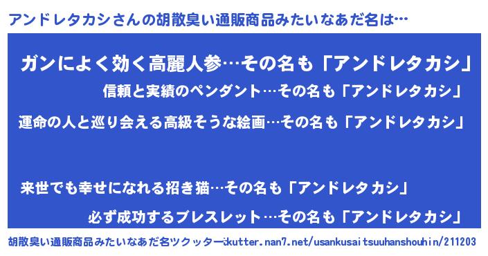 | 欧米人風あだ名 | 『アンドレタカシクリステル』 |