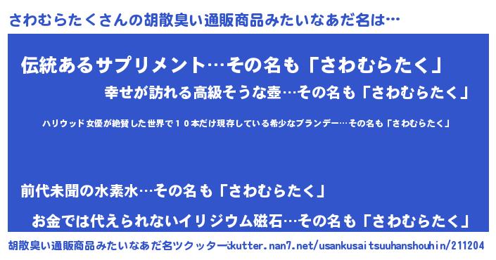 | 意味不明あだ名 | 『住所不定無職さわむらたく(77歳)』 |