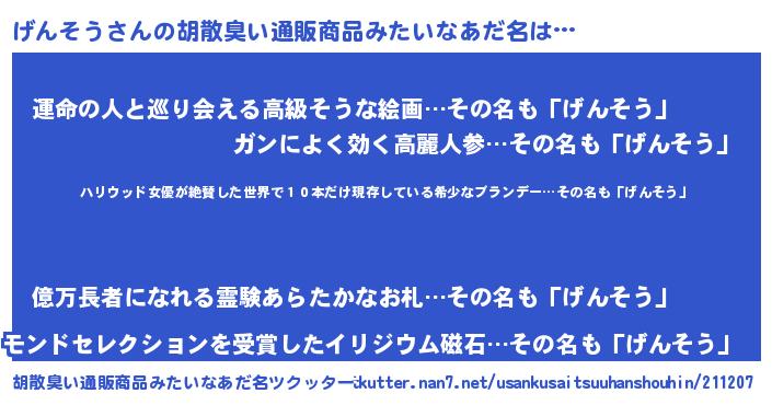 | 男性向けラノベタイトル風あだ名 | 『魔弾の王とげんそう』 |