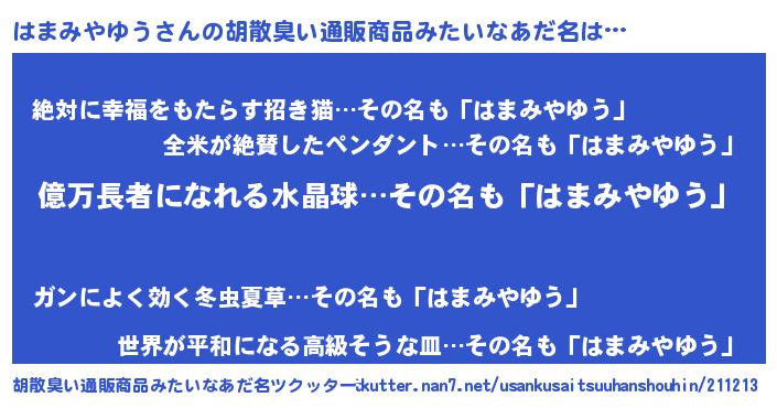 | ヘコむあだ名 | 『はまにゅー』『はまみやゆう(笑)』 |