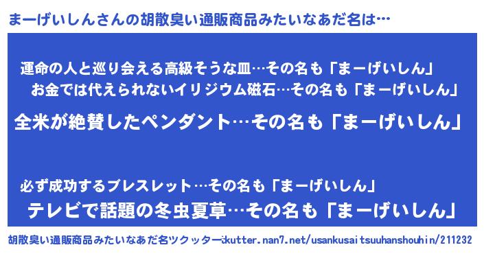 | 男性向けラノベタイトル風あだ名 | 『まーげいしん~年齢イコール彼女いない歴の魔法使い~』 |
