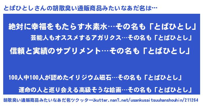 | ヘコむあだ名 | 『とばお』『とばひとし(苦笑)』 |