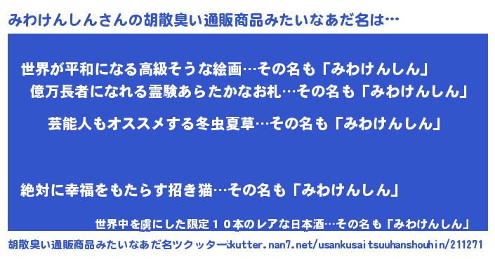 | 意味不明あだ名 | 『自称みわけんしん』 |