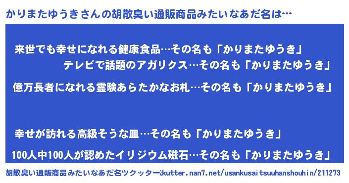 | 男性向けラノベタイトル風あだ名 | 『かりまたゆうき~年齢イコール彼女いない歴の魔法使い~』 |