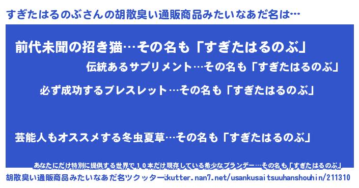 | 男性向けラノベタイトル風あだ名 | 『すぎたはるのぶの憂鬱』 |