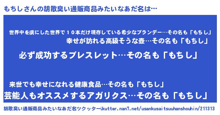 | 男性向けラノベタイトル風あだ名 | 『もちしの憂鬱』『はたらくもちしさま!』 |