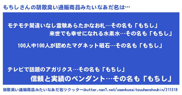| 男性向けラノベタイトル風あだ名 | 『はたらくもちしさま!』『緋弾のモチシ』 |