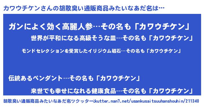 | 男性向けラノベタイトル風あだ名 | 『ノーゲーム・ノーカワウチケン』 |