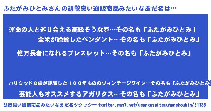 | 男性向けラノベタイトル風あだ名 | 『フタガミヒトミアートオンライン』 |