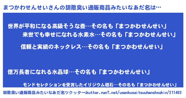 | 男性向けラノベタイトル風あだ名 | 『ダンジョンにまつかわせんせいを求めるのは間違っているだろうか』 |