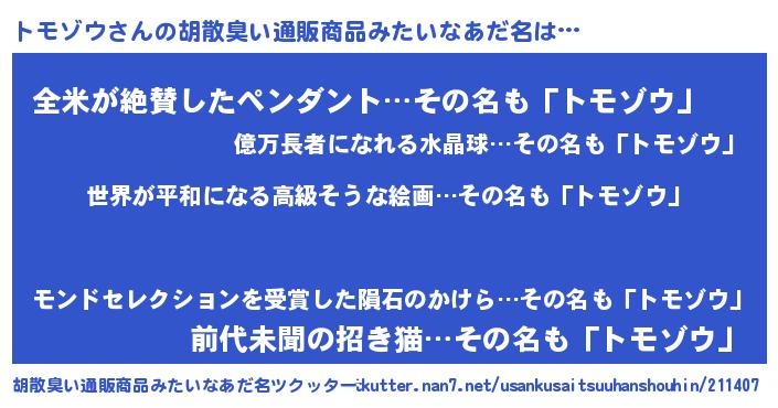 | 欧米人風あだ名 | 『トモゾウクリステル』 |