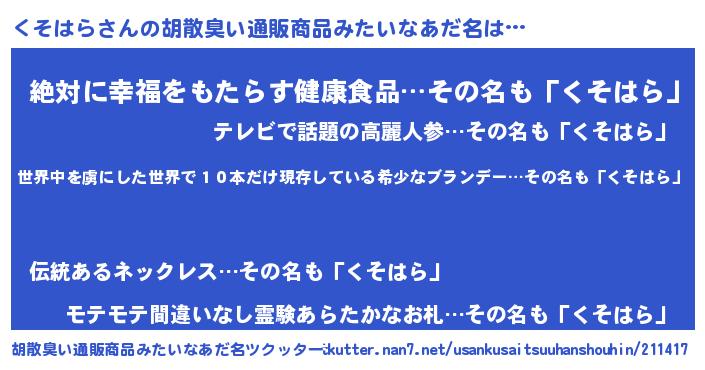 | 意味不明あだ名 | 『住所不定無職くそはら(74歳)』 |