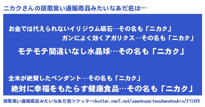 | 男性向けラノベタイトル風あだ名 | 『ニカクの憂鬱』『はたらくニカクさま!』 |
