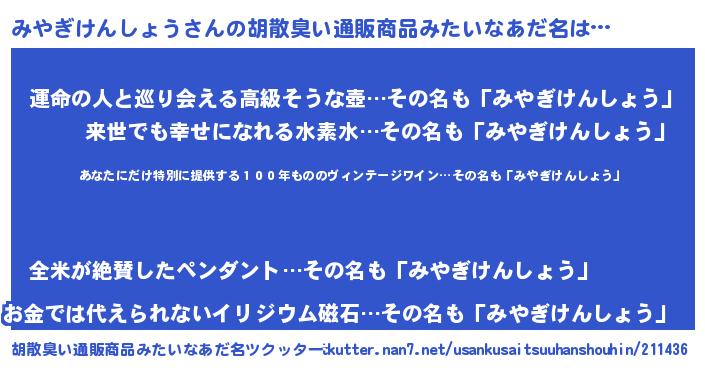 | 意味不明あだ名 | 『住所不定無職みやぎけんしょう(3歳)』 |