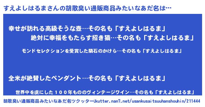 | ヘコむあだ名 | 『酢こんぶ』『すえよしはるま(爆)』 |