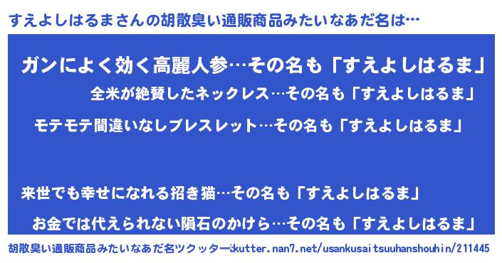 | 男性向けラノベタイトル風あだ名 | 『すえよしはるまに滅ぼされるだけの簡単なお仕事です』 |