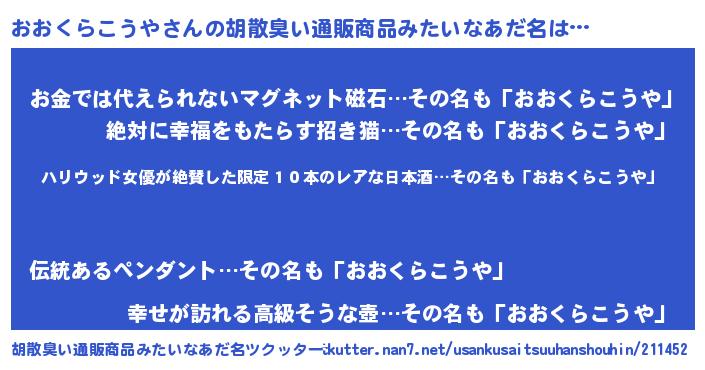 | ヘコむあだ名 | 『つくし』『おおくらこうや(爆)』 |