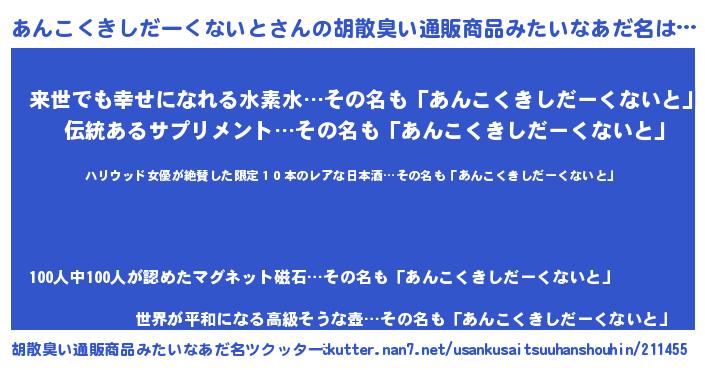| 男性向けラノベタイトル風あだ名 | 『魔弾の王とあんこくきしだーくないと』 |