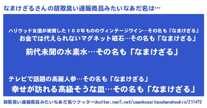 | ヒーロー風カッコイイあだ名 | 『ネオナマケザル』『仮面ナマダー』 |